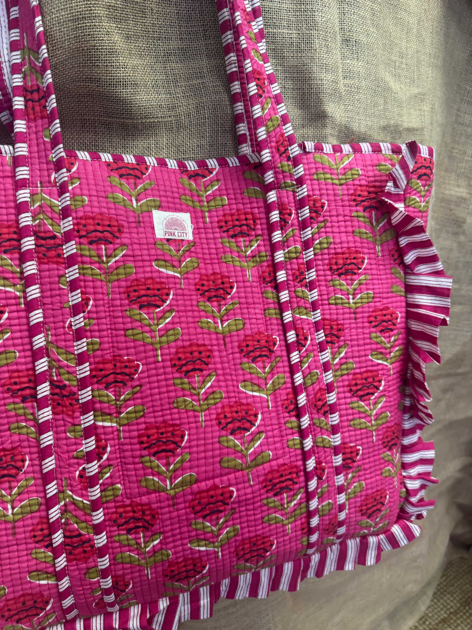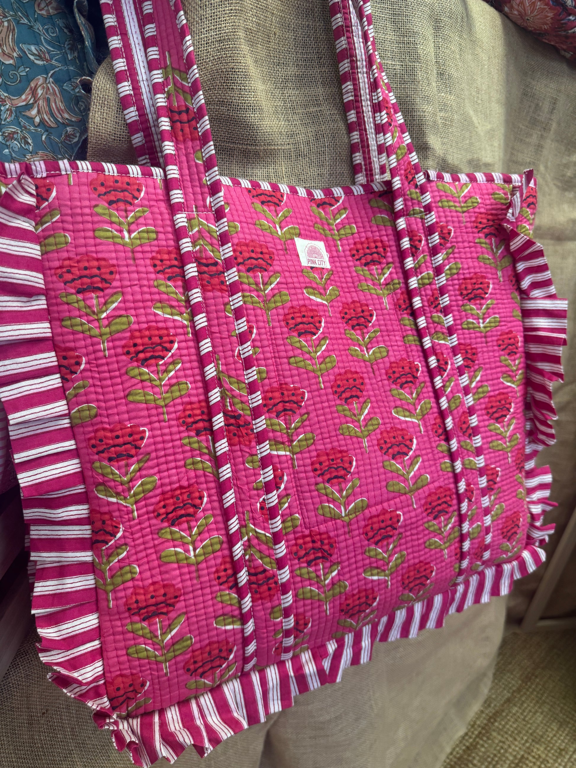 Bright and beautiful, our Hot Pink Floral Frill Tote is hand block-printed in Jaipur with vibrant red florals and leafy greens on a bold pink background. Finished with a striped frill and lining, it’s a joyful carryall that makes every day feel special.