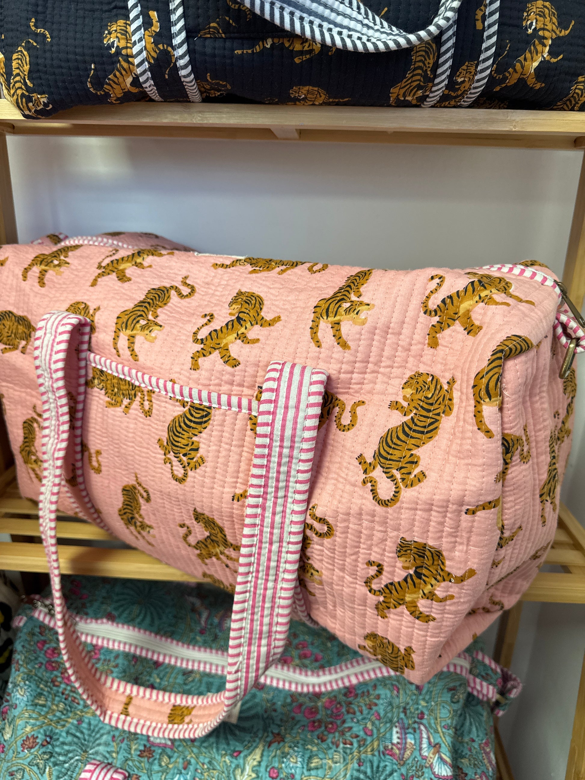 Turn heads with our Baby Pink Leopard Weekend Bag – a playful twist on a classic travel essential. Handmade in Jaipur from 100% cotton with quilted detail, this spacious yet lightweight holdall is designed for every adventure.