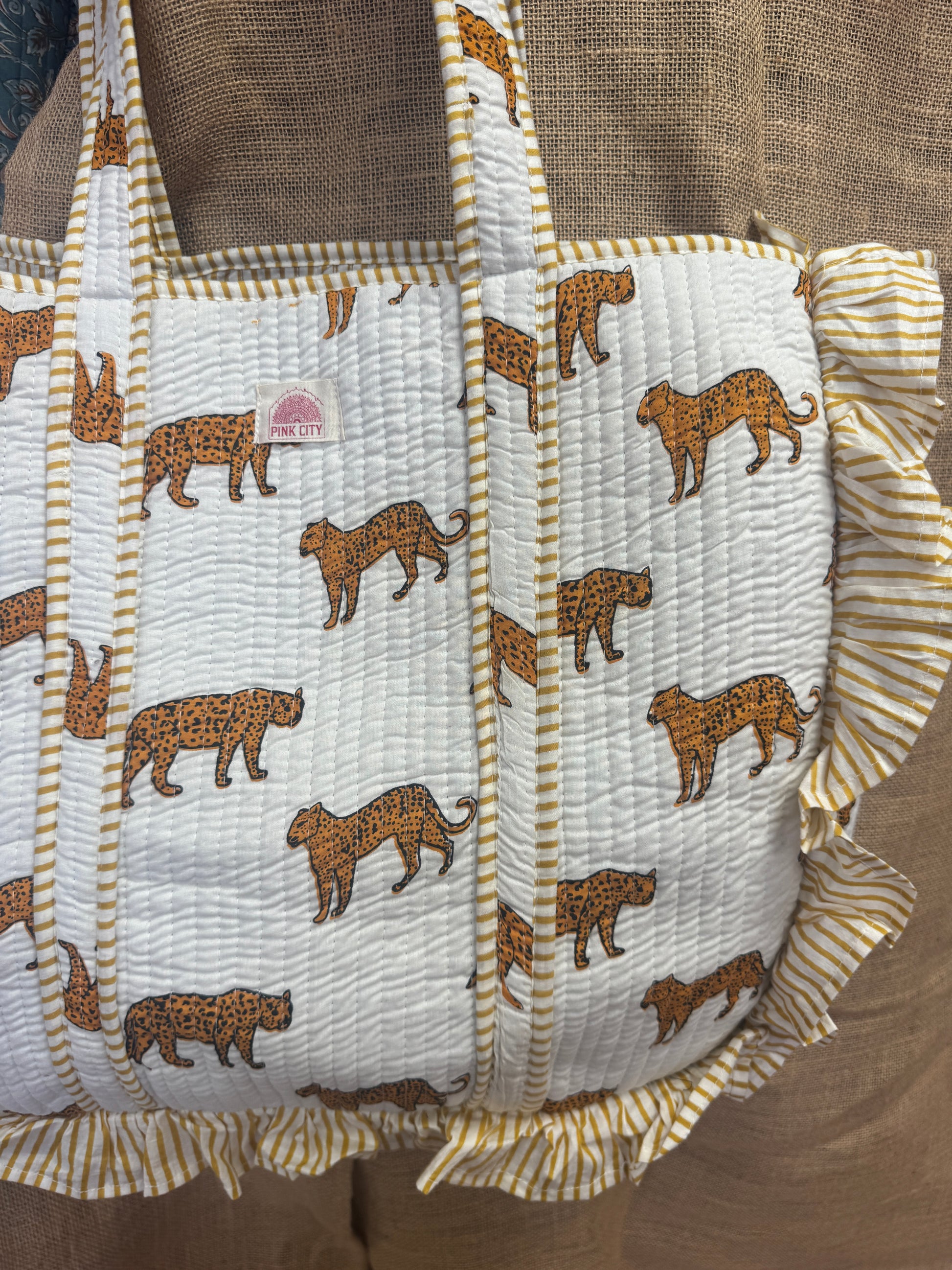 Fresh and bold — our White Leopard Frill Tote features hand block-printed leopards on a crisp white quilted cotton, framed with a golden striped frill and lining. Handmade by artisans in Jaipur, this tote blends playful design with everyday practicality.